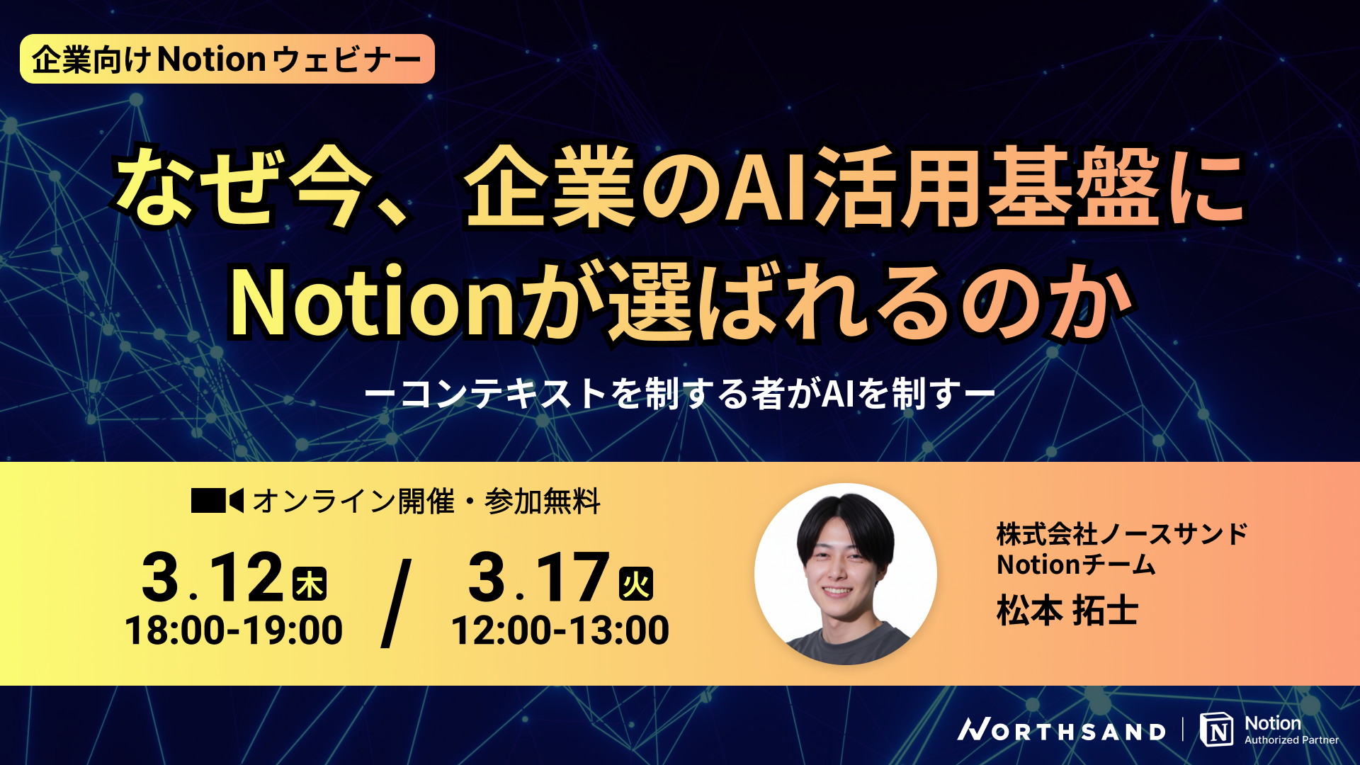 本ウェビナーでは、企業がAI活用で成果を出すために必要なコンテキスト基盤という考え方と、なぜNotionがその基盤として選ばれているのかを、実際のデモを交えてお伝えします。