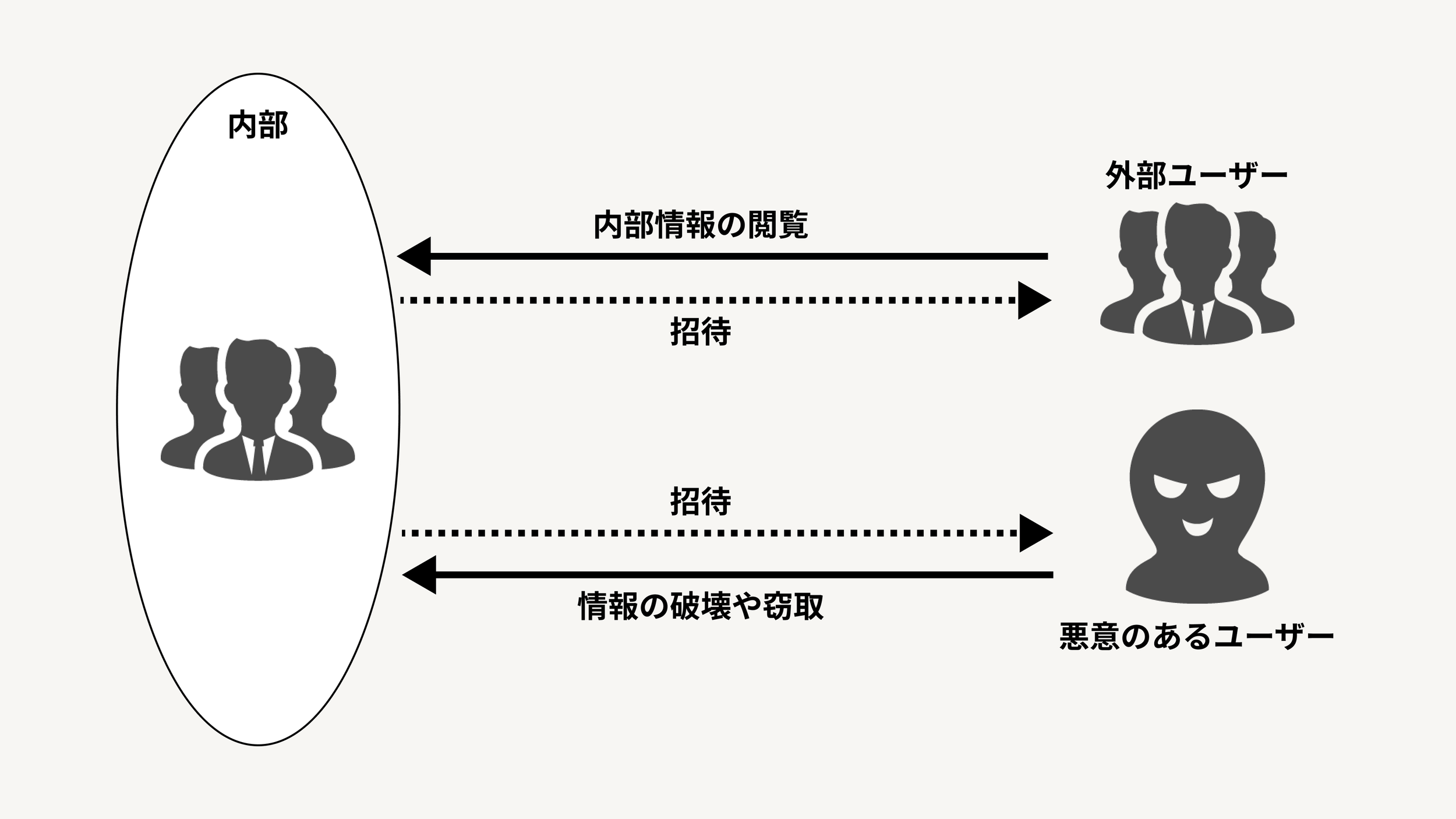 こちらは情報の流出のリスクが考えられます。例えば他のワークスペース上にお客様がいる場合や自分自身がゲストユーザーとして他の企業や組織のワークスペースに招待されている場合に、内部の情報を外部へ、又は外部の情報を内部へ流出させてしまう恐れが出てきます。こちらも最小限のアクセス権限を付与することが大切です。社内のメンバーだけでなくゲストユーザーの権限もしっかりと管理する必要があります。