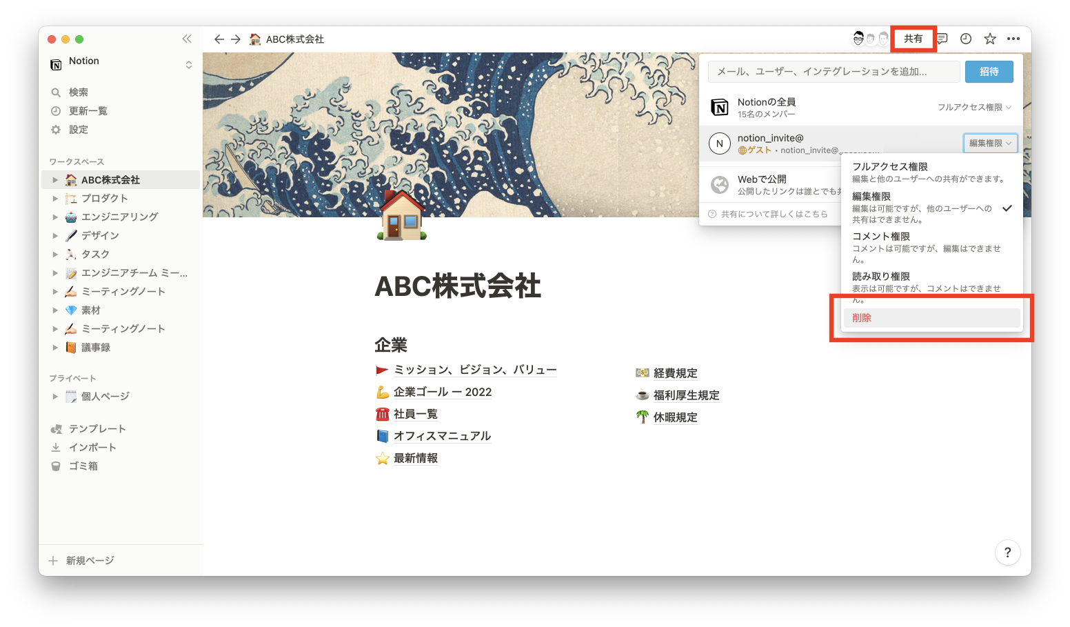ワークスペースのオーナーの権限を持っているメンバーでは、それぞれのゲストがアクセスできるページや権限まで、細かく確認や削除をすることができます。