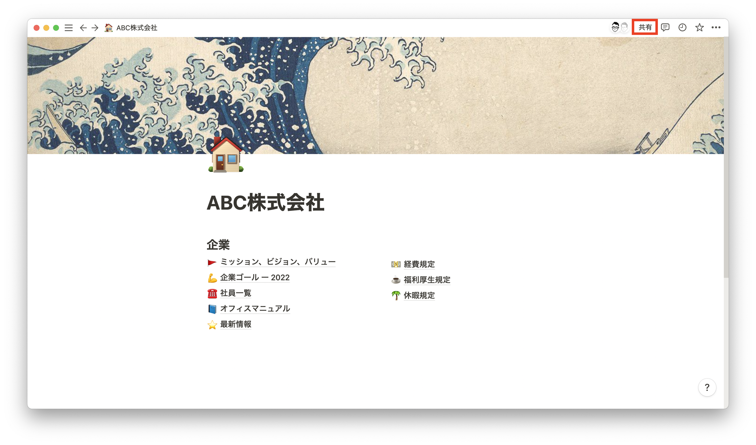 ページの右上にある「共有」ボタンから、ゲストの削除ができます。特定のページからゲストを削除する場合は、この方法がおすすめです。