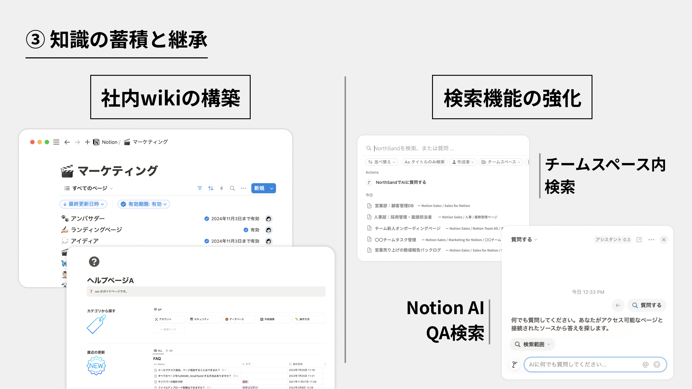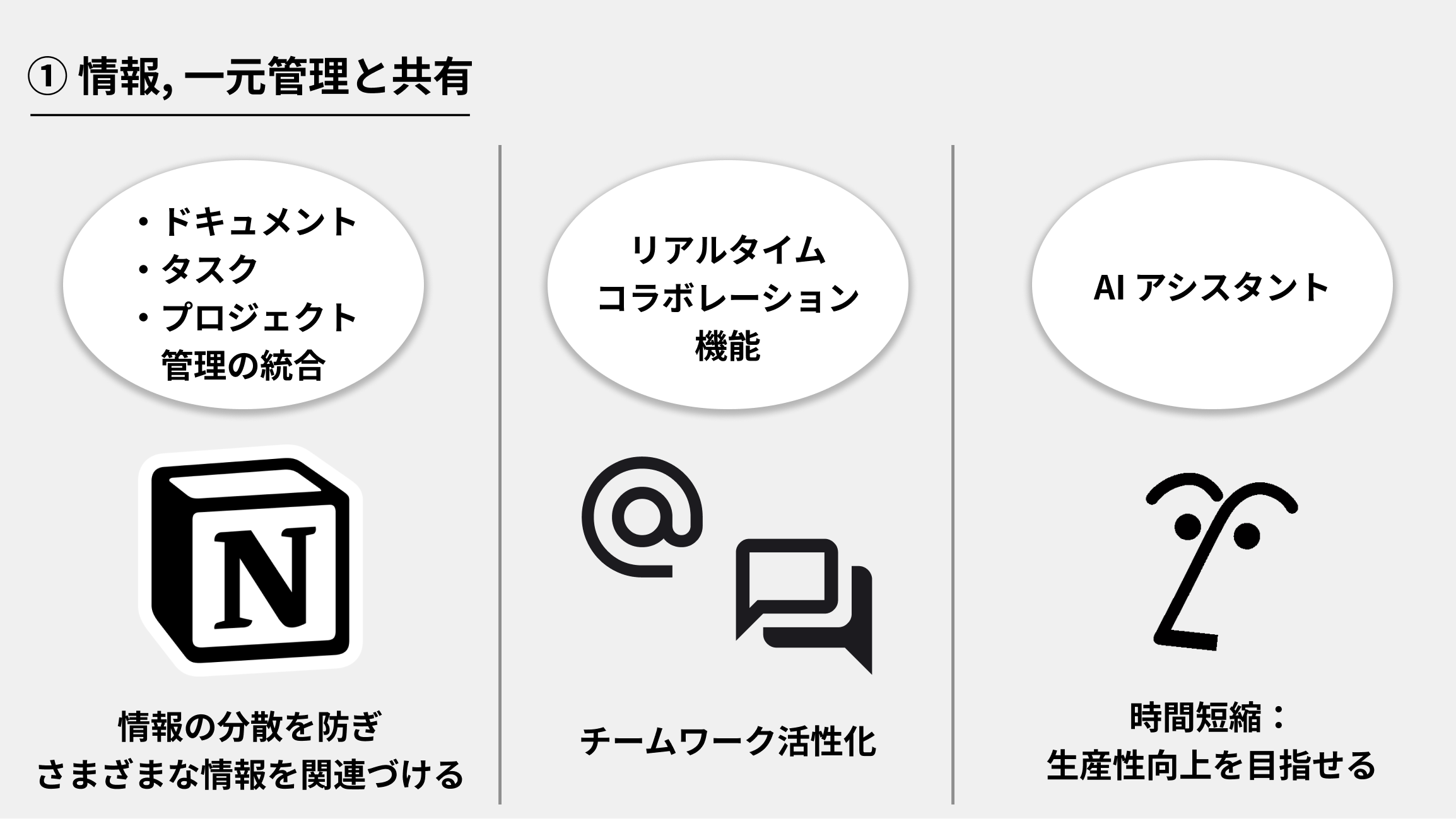 多くの組織が抱える情報共有の課題に対して、Notionは3つの重要な解決策を提供します。それぞれについて、具体的な機能と実践的な活用方法をご紹介します。