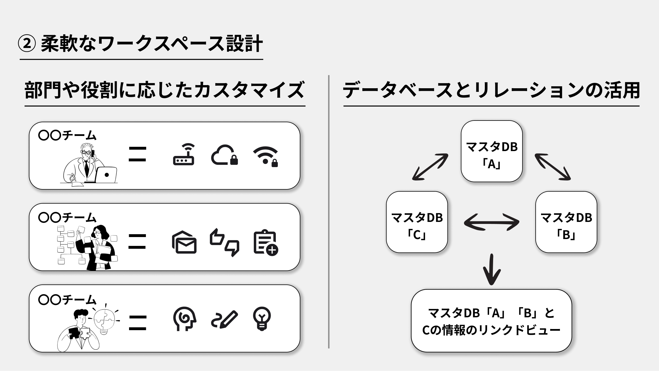 部門や役割に応じたカスタマイズ可能なワークスペースを提供し、データベースとリレーションの活用で、情報の関連性を明確に把握できます。これにより、組織全体の業務効率が大きく向上します。