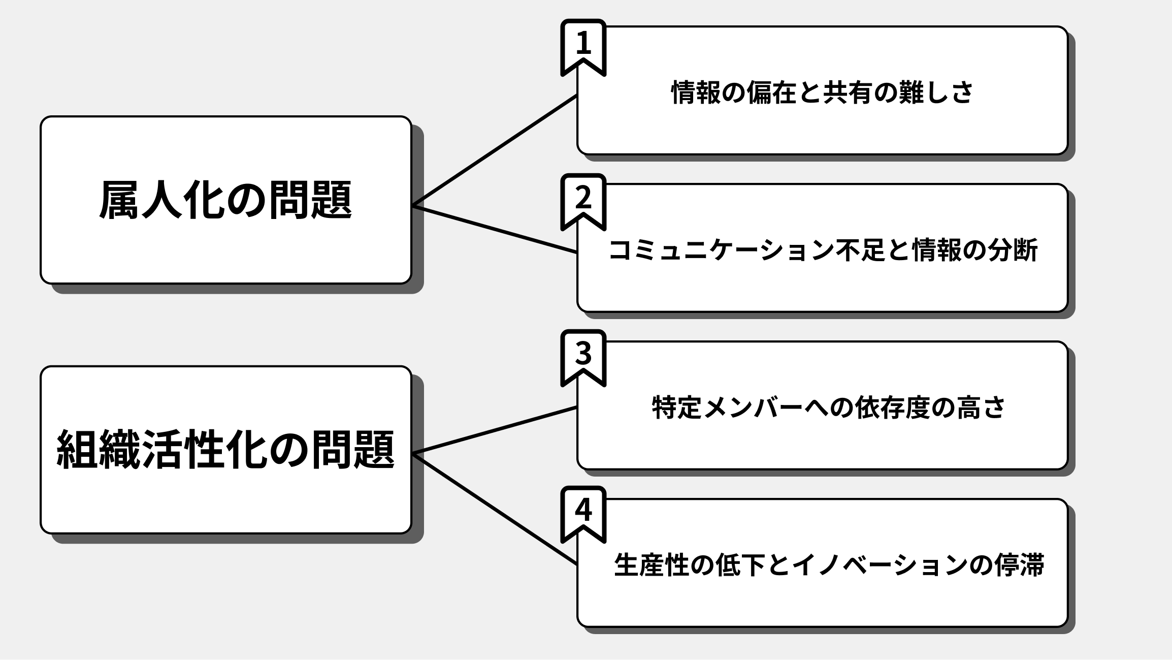 特に注目すべきは、「情報の属人化」と「組織の活性化不足」という2つの根本的な問題です。これらの課題は、組織の規模拡大とともに深刻化し、生産性低下やイノベーション創出の障壁となっています。