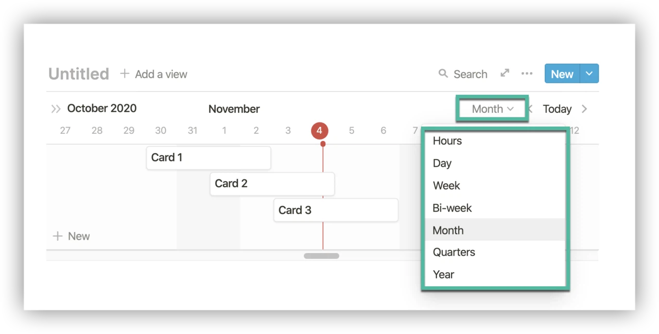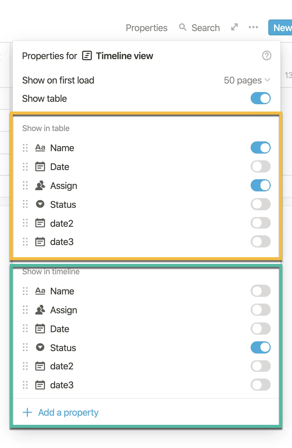 これは、ボード(カンバン)などと同じですね。Dateプロパティのカラムがあれば自動で適用されますが、Dateプロパティが複数ある場合などは、Timeline by から変更も可能です。