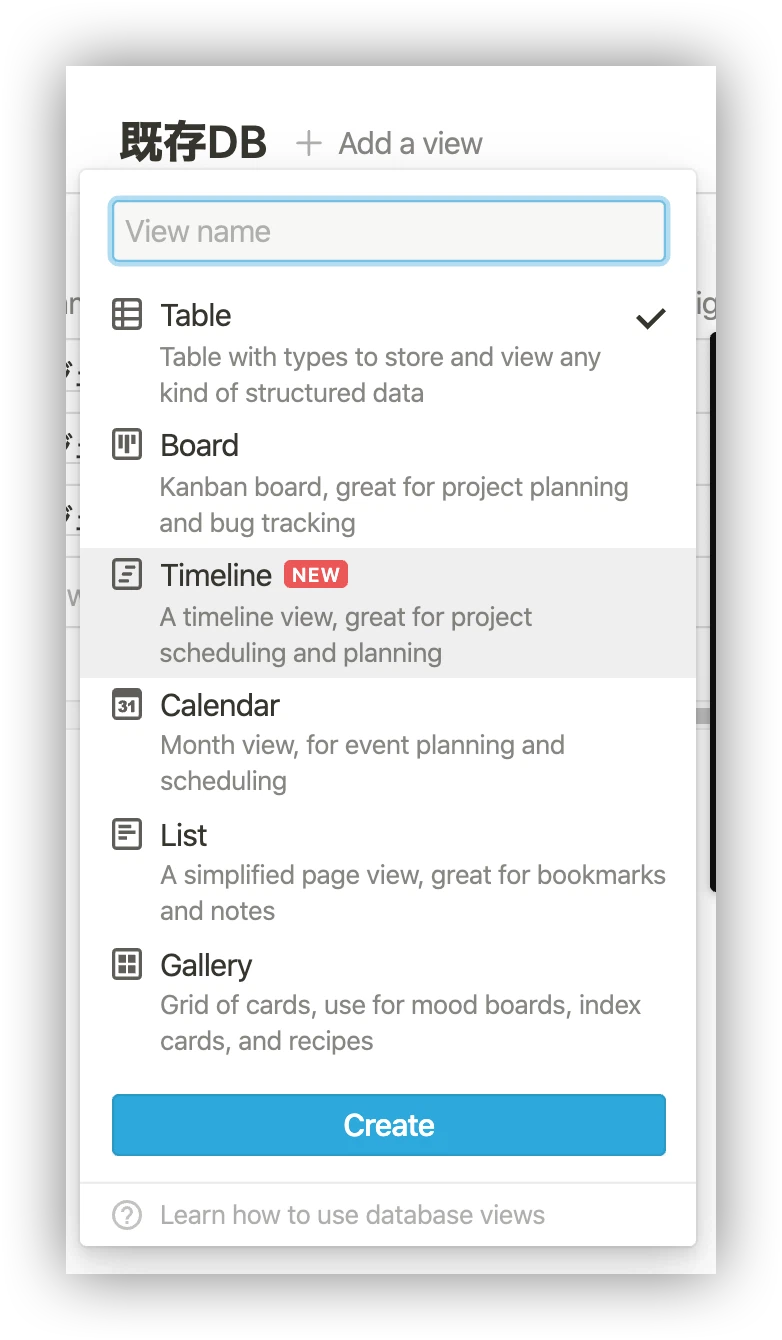 既存DBの Add a view のビューの追加から、 Timelineを追加しましょう。