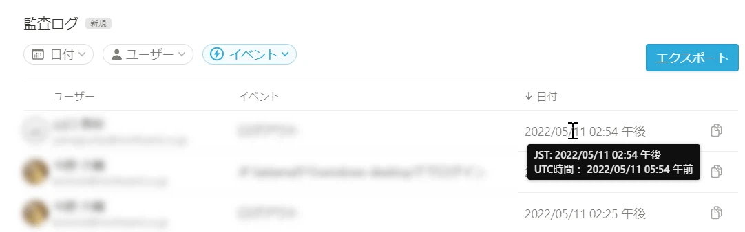 日付や対象ユーザー、イベント(操作内容)を指定して検索するメニューが用意されています。