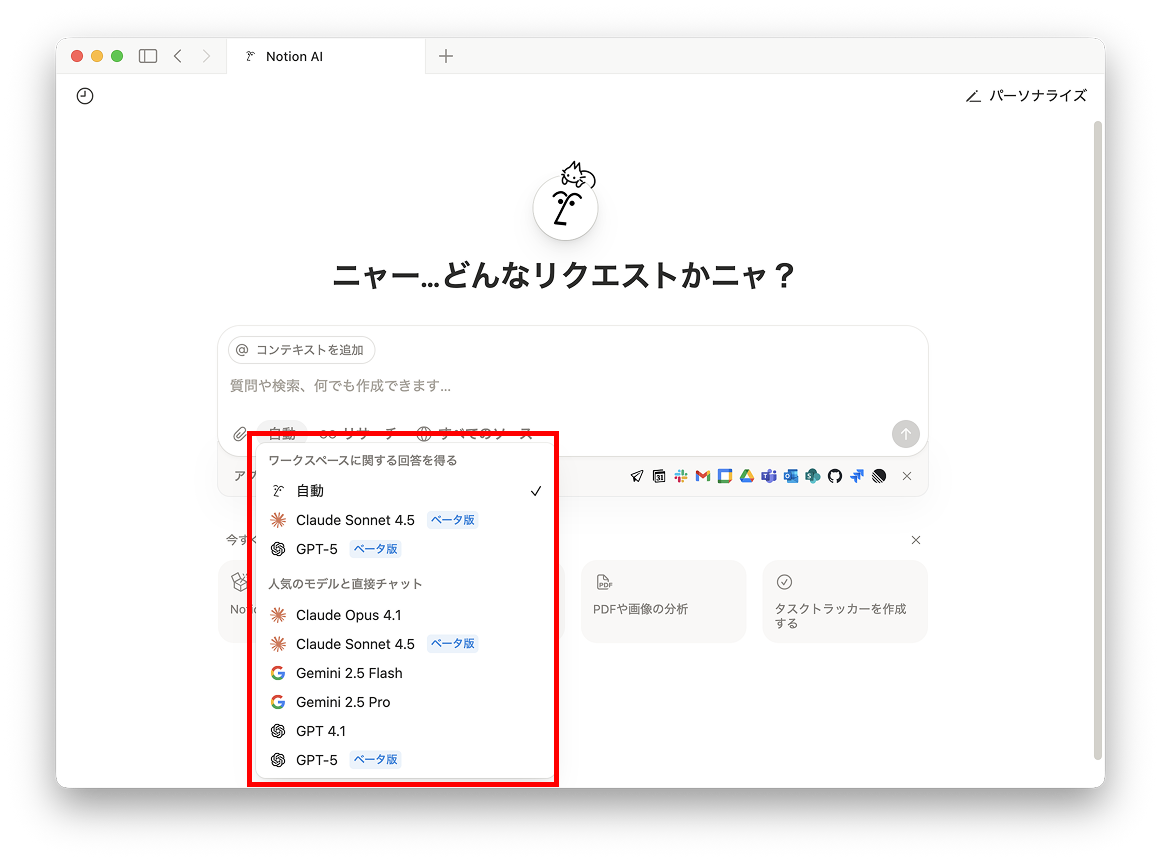 Notion AIは複数LLMの先進モデルを統合しており、チャットでは個別で各モデルを選択することもできます。これにより、会議メモの自動作成やAI検索など、高度な業務効率化を実現することができる他、要約やブレストといった業務に合わせて最適なモデルを選択できます。組織の成長に合わせて柔軟にスケールし、長期的に企業の情報基盤を支えるのがエンタープライズプランの魅力といえるでしょう。