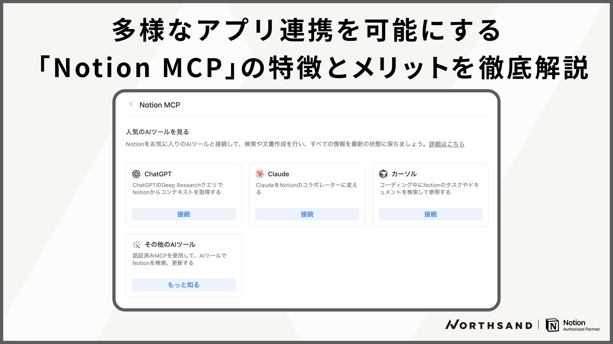特に、CursorやClaudeがMCPに対応を開始したことにより、ユーザーは、使い慣れたAIツールを通してNotionを直接操作できます。これにより、Cursor上でNotionのデータを参照しながらコードを書くことができます。そのほか、ClaudeからNotionタスクを更新するなど、さまざまな使い方が可能です。
