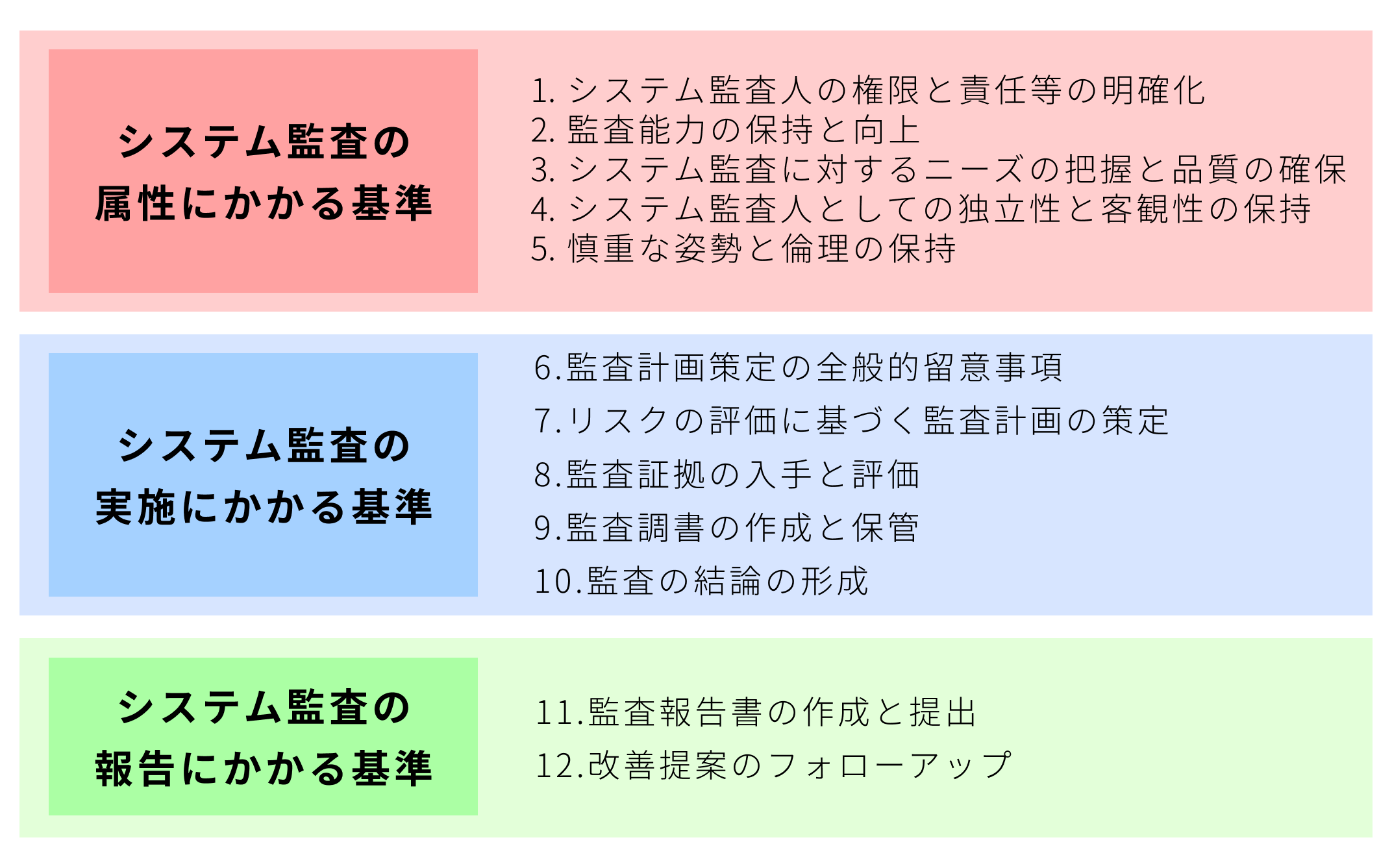 経済産業省の「システム監査基準」では、主に以下12の監査基準が定められています。