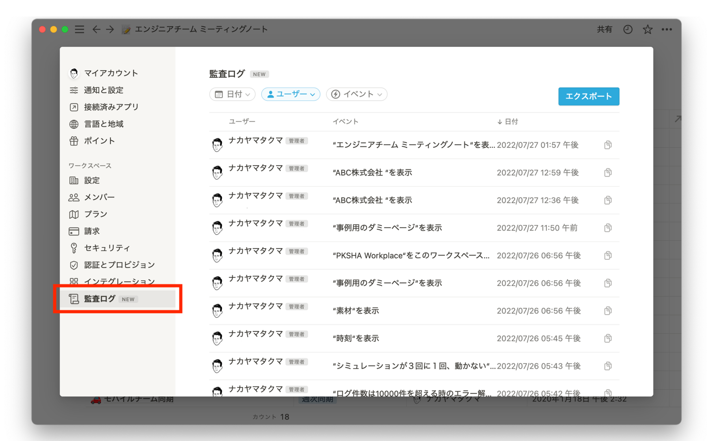 企業の監査では、アクセスログ、変更履歴、データ取得状況など、さまざまな証跡(Evidence)が必要です。Notionエンタープライズプランでは、以下の機能によって監査用のデータ取得ができます。