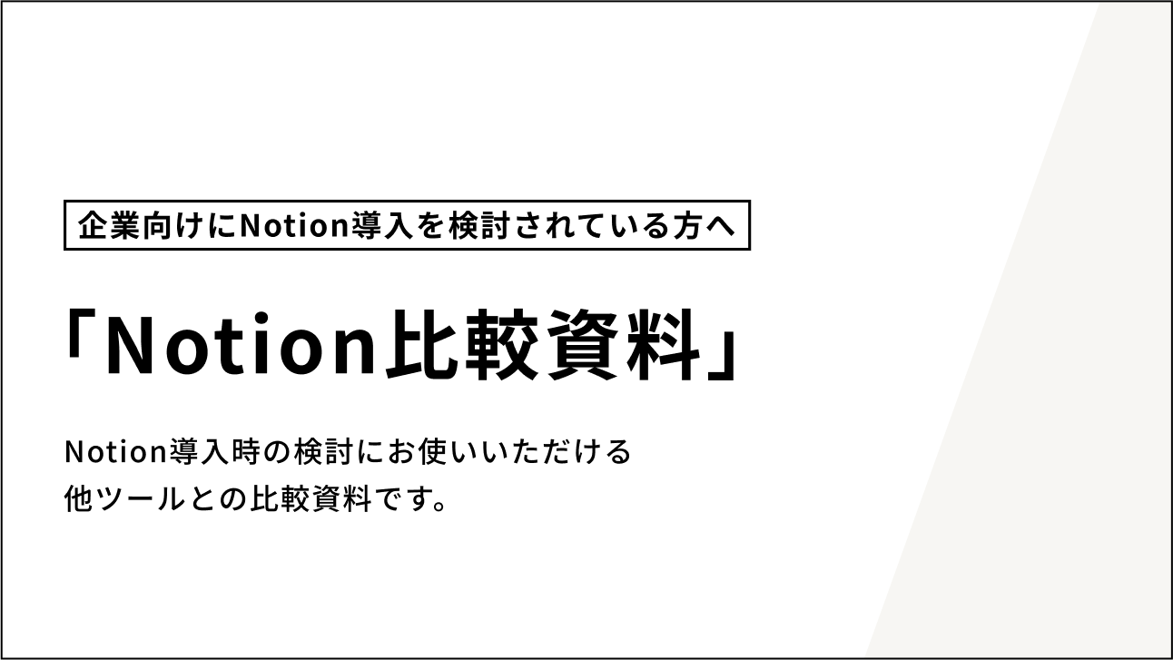 本誌は、Notion導入時の検討にお使いいただける参考資料です。各製品の最上位プランで比較していますが、Notionと同等の製品がないため、一般概念レベルでの比較となります。 Notionと他製品を機能レベルで比較検討することはお勧めしておりませんが、どうしても必要な場合はこちらの資料をご利用ください。