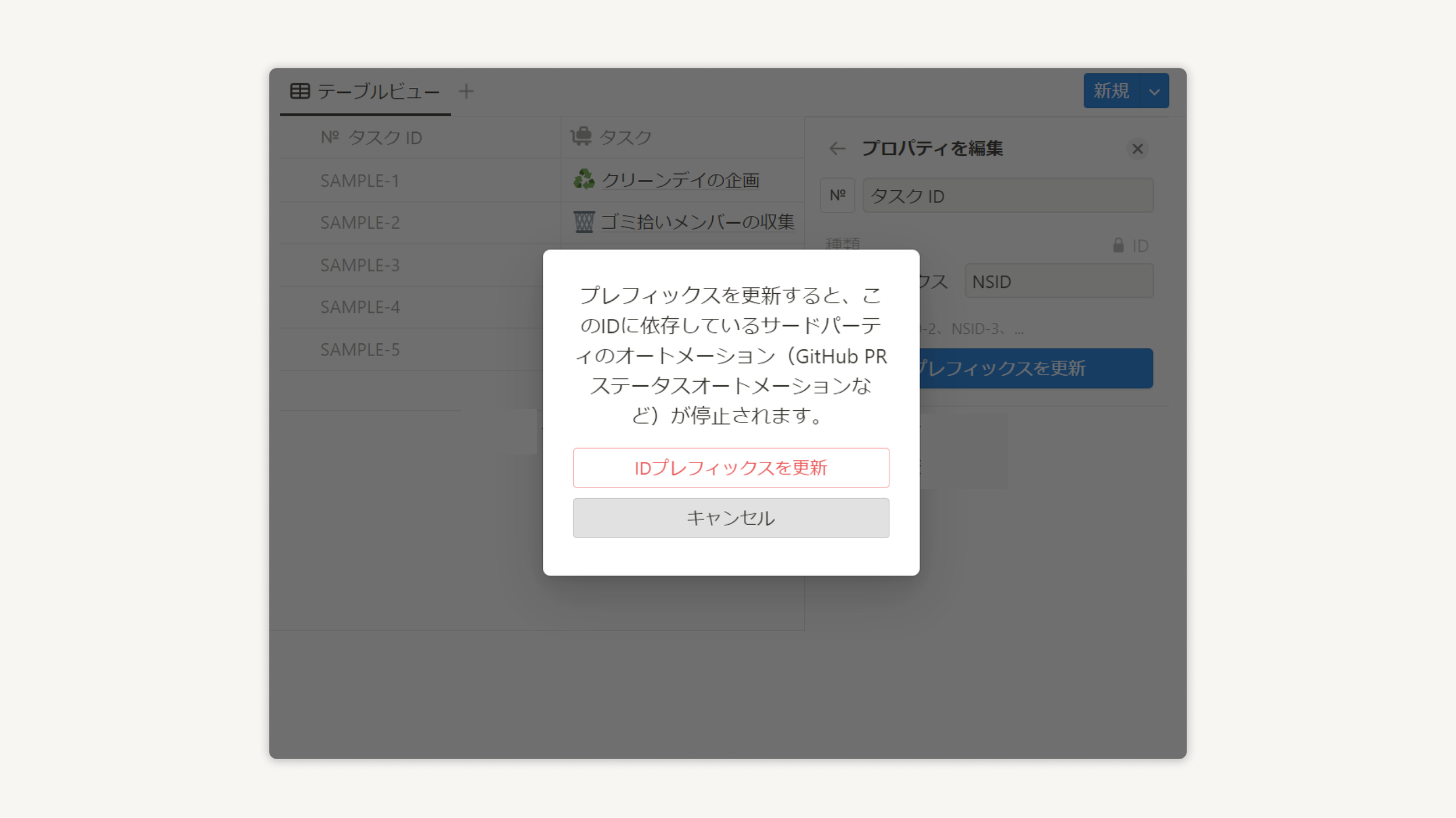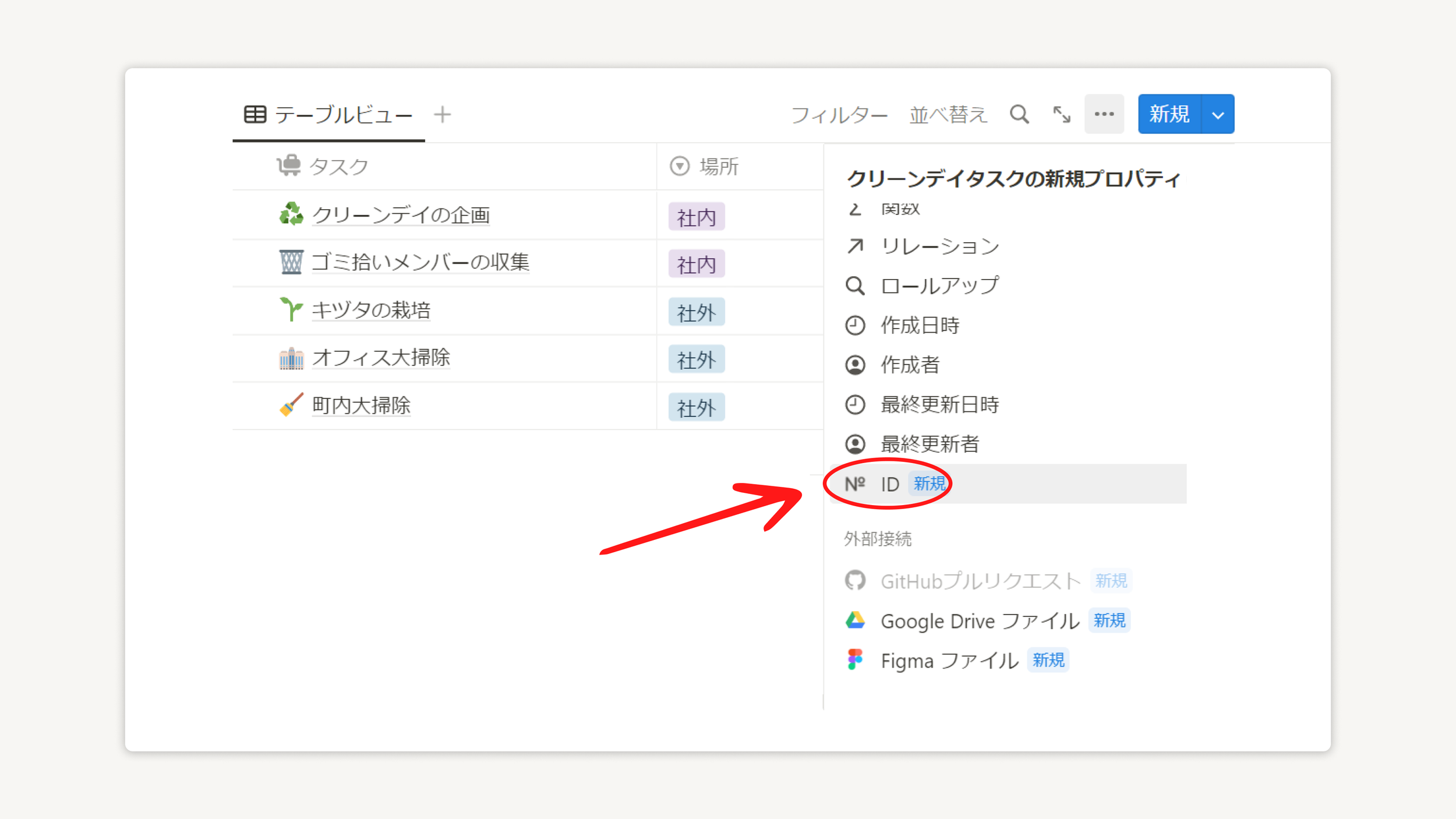 上記のように設定した場合、「クリーンデイの企画」ページのユニークIDが「NSID-1」となり、「notion.so/NSID-1」のURLでそのページ・タスクにアクセスできます。