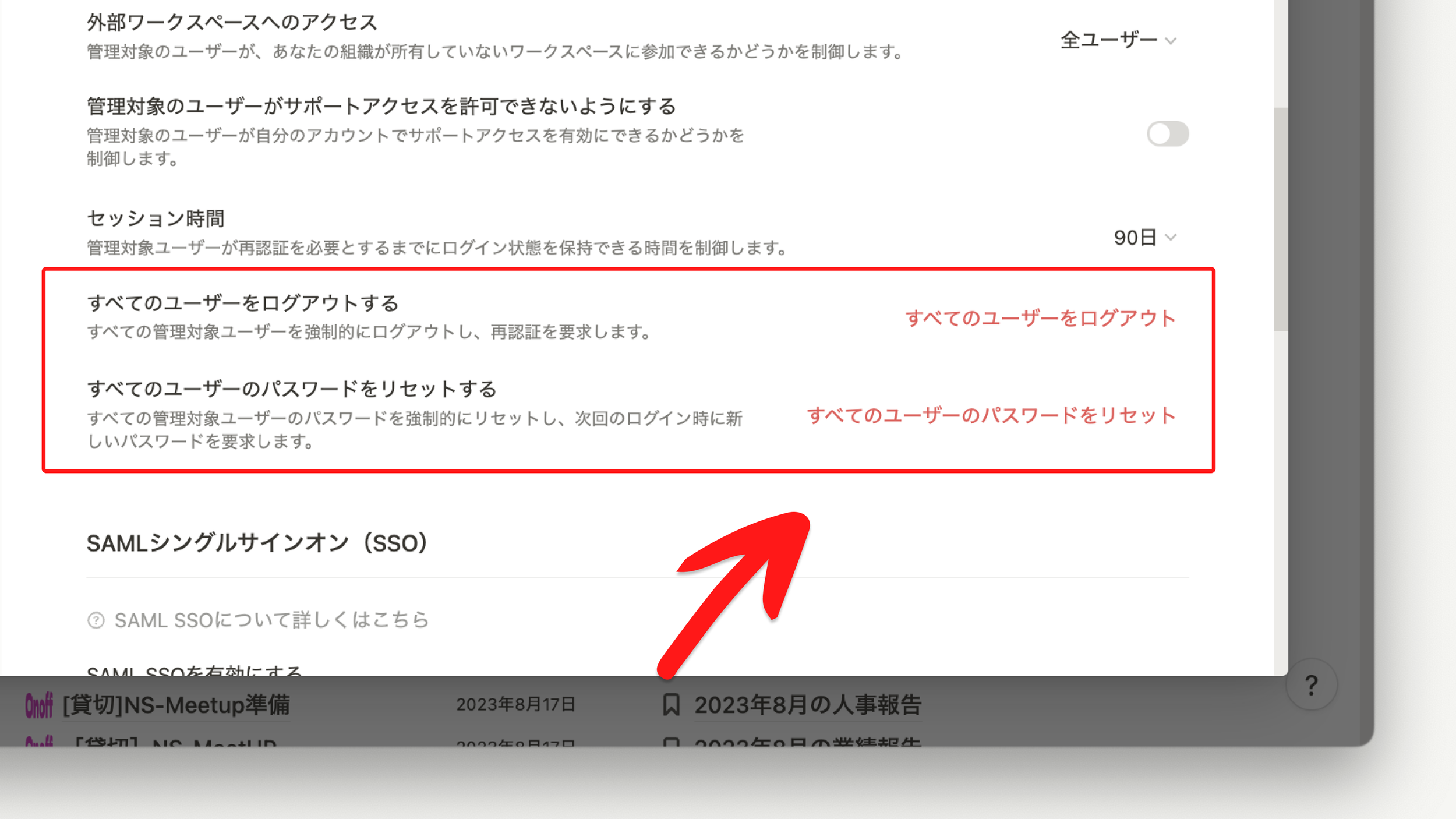 すべてのユーザーをログアウト、パスワードをリセット