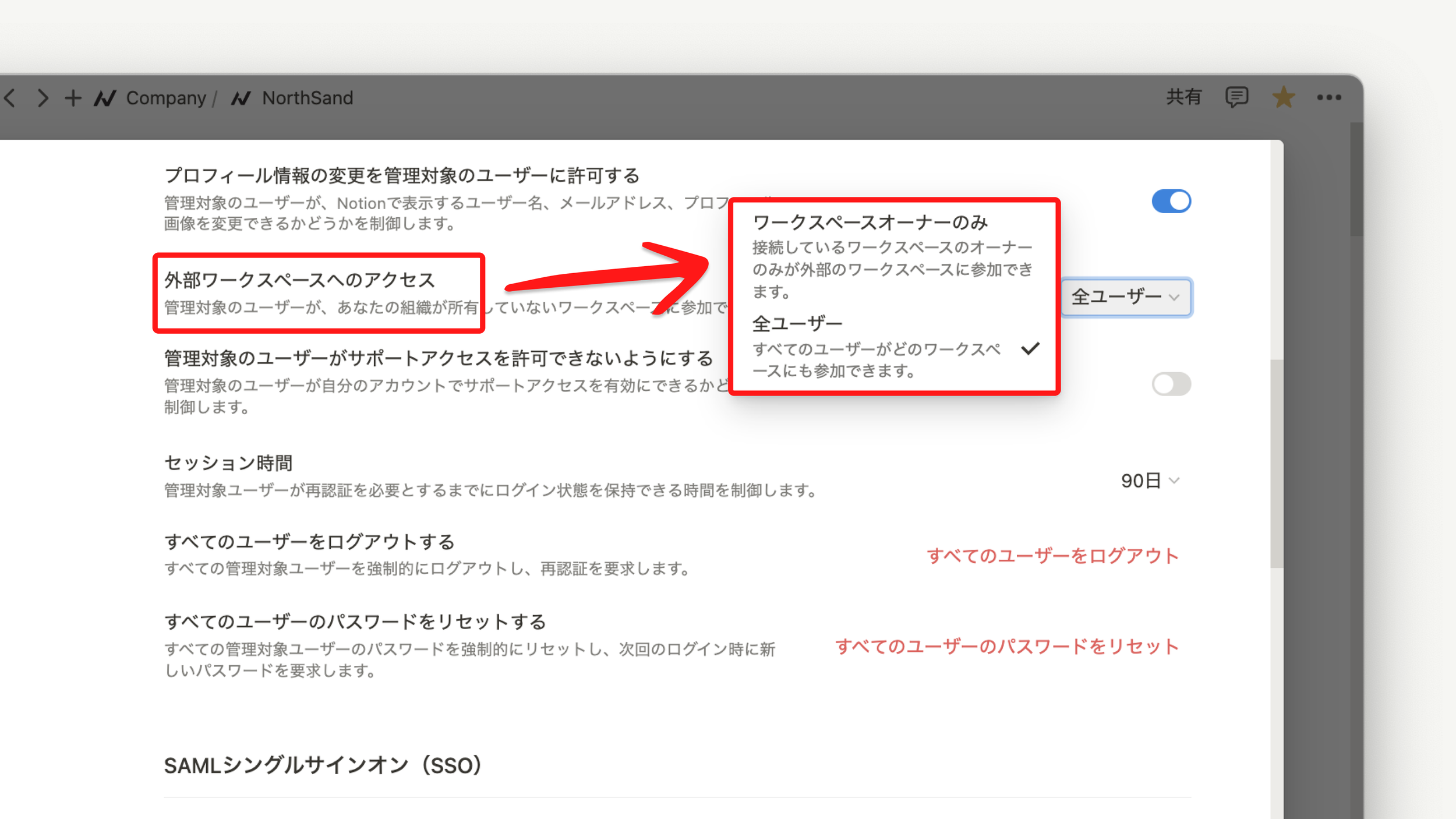 この設定では管理対象ユーザーが外部ワークスペースに参加できるかどうかを制御することが可能です。
