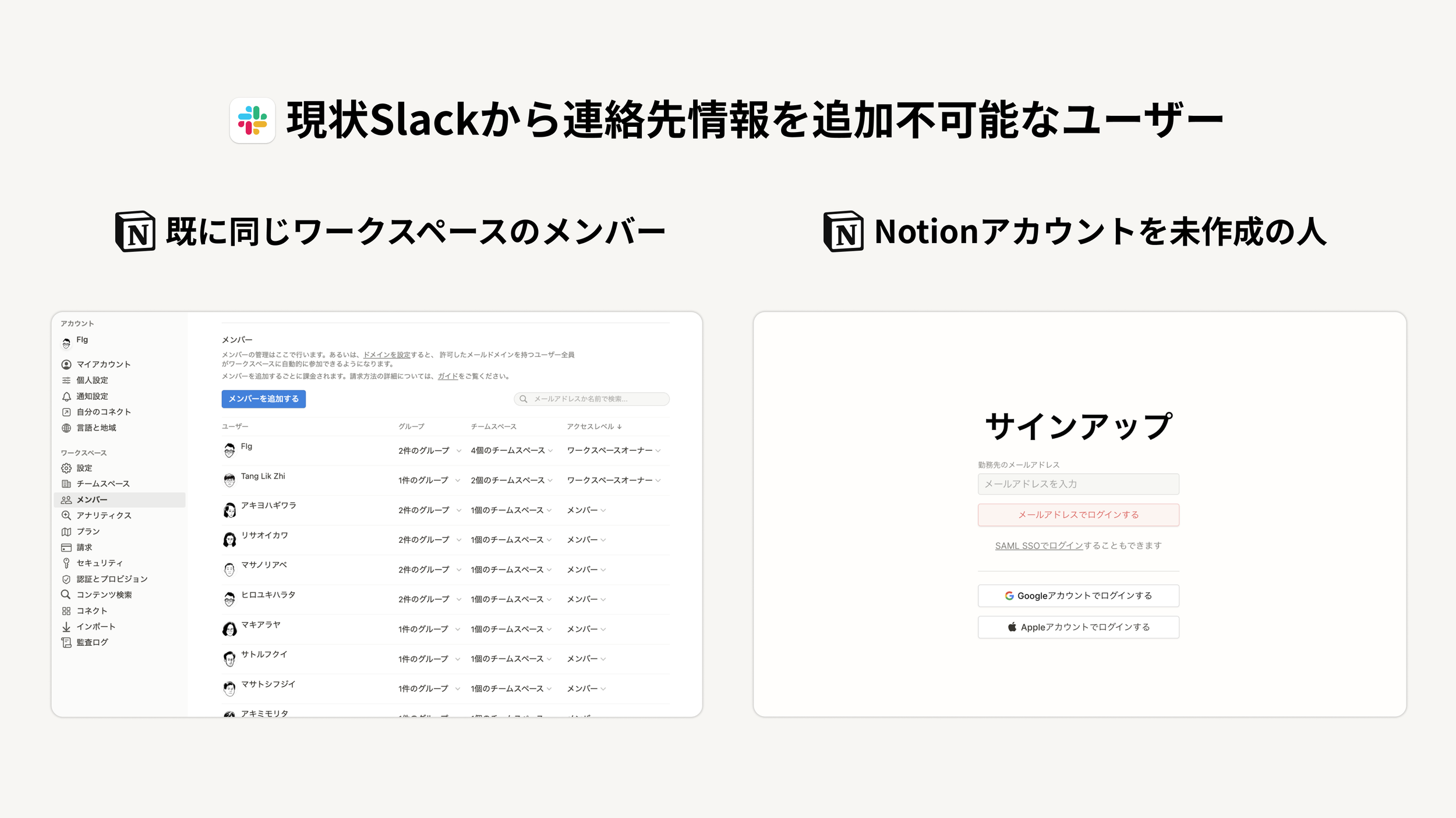 現状では、NotionにアカウントがないユーザーをSlack経由で招待できないようになっています。
