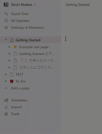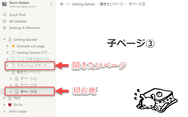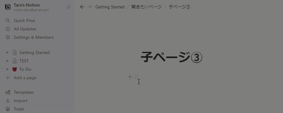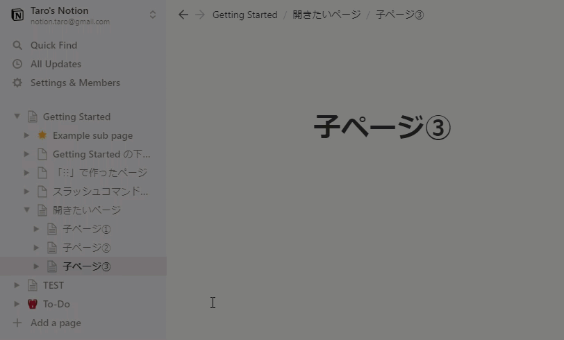 先ほどと同じく、子ページ③にいるときに、「Getting Started」配下の「スラッシュコマンドで作成したページ」を開きたいとしましょう。