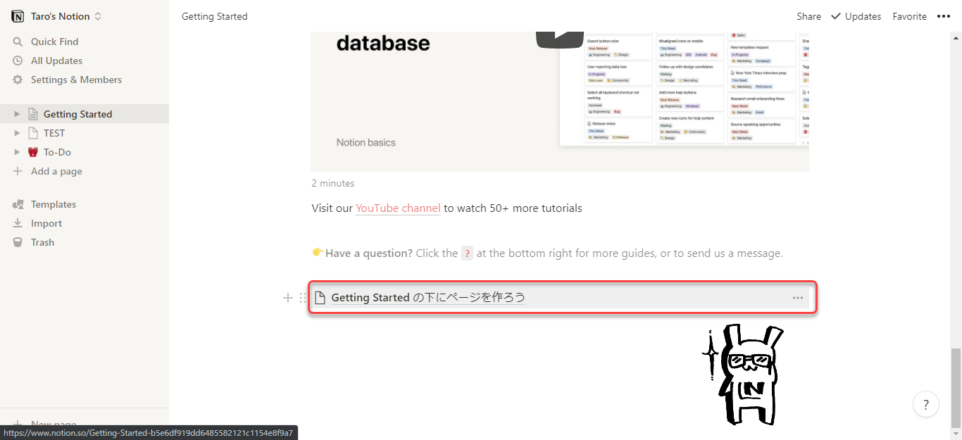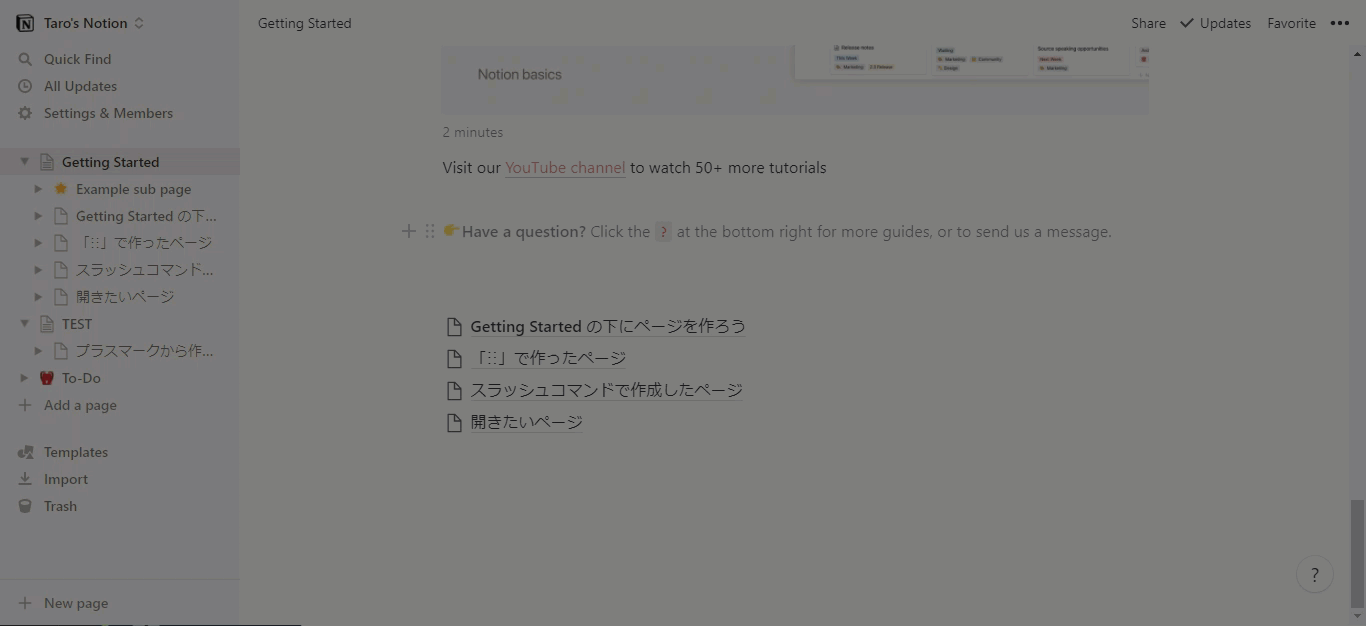 子ページ③→(戻るボタン)→開きたいページ→(戻るボタン)→Getting Started→(ページ名クリック)→スラッシュコマンドで作成したページ