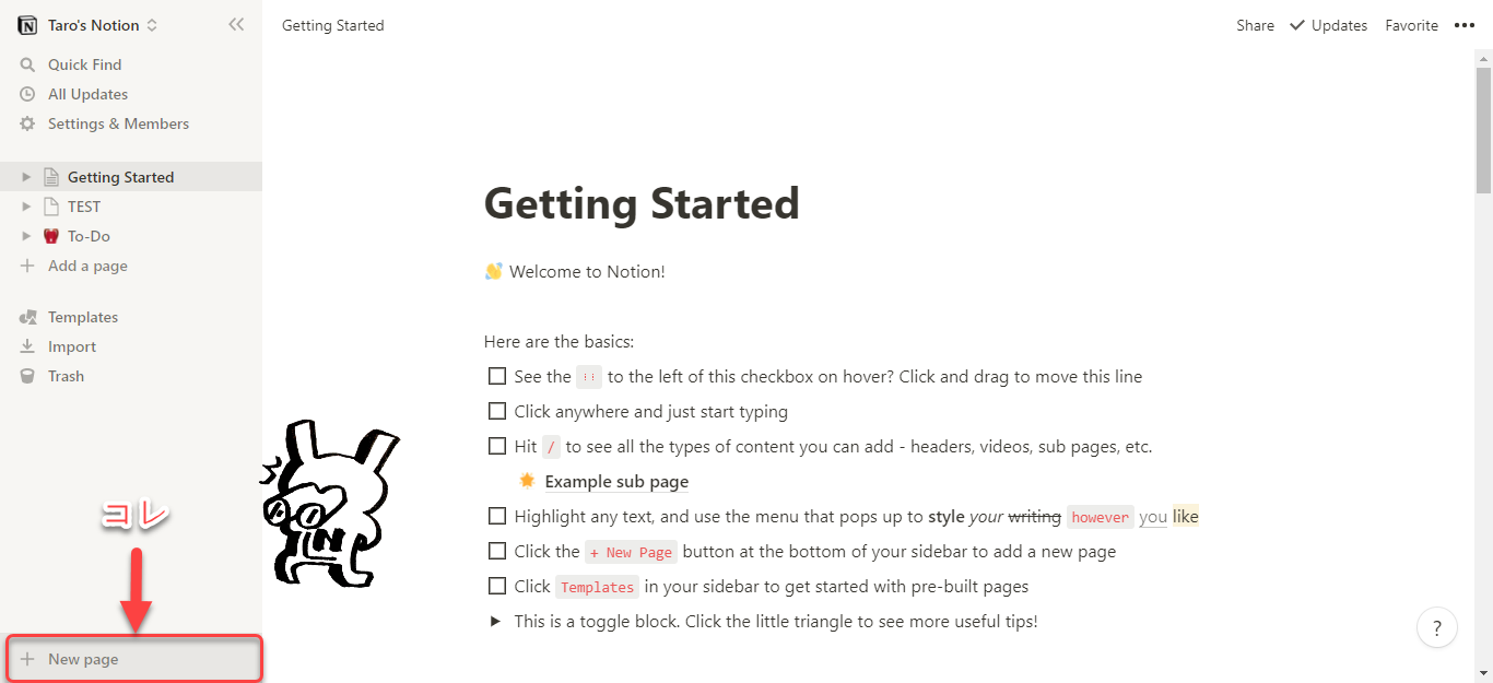 サイドバーにある「+ New page」ボタンをクリックして新しいページを作成する方法です。