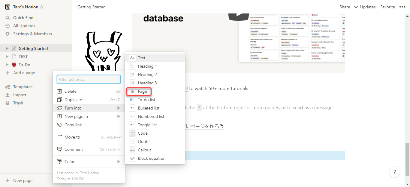 「⋮⋮」をクリックすると、このようにメニューが表示されますので、「Turn into」の上にポインタを乗せます。