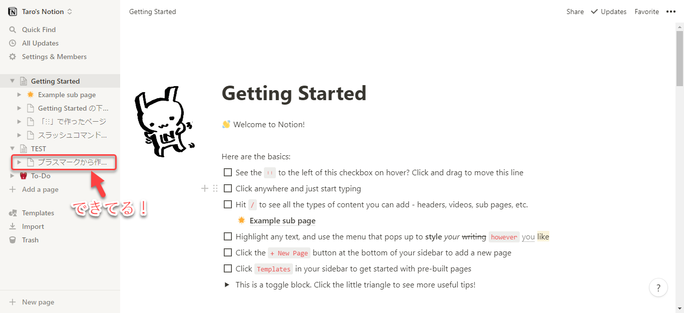 と、サイドバーの「TEST」の配下にページがちゃんとできているのが見えますね~。 でも右側で閲覧しているページは「Getting Started」のまま。