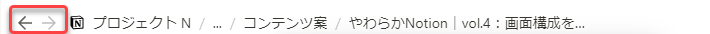 Breadcrumbの一番左端には、左右を向いた矢印が表示されています。これは、ウェブブラウザの戻る・進むボタンと同義ととらえてよいです。 (というかブラウザでNotionをお使いの場合は、そもそもこの矢印ボタンはないですね。)