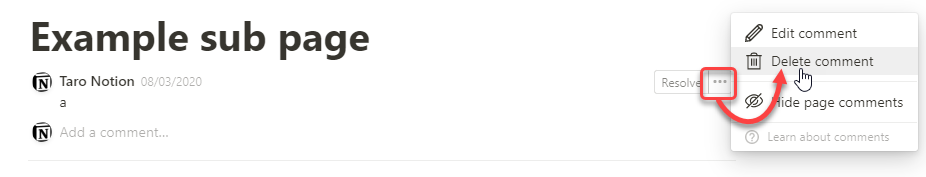 ちなみにDiscussionは削除ボタンがなかったのでけっこう困ってたんですが、先日追加されて筆者はうれしい限りです。Discussion欄右上の「・・・」のマークから「Delete comment」をクリックすれば消えてくれます。一時的に隠しておいて後でまた見たい時は、Deteleではなく「Hide page comments」を使いましょう。 「・・・」の左の「Resolve」ボタンを押せば、不要になったコメントを消すこともできます。